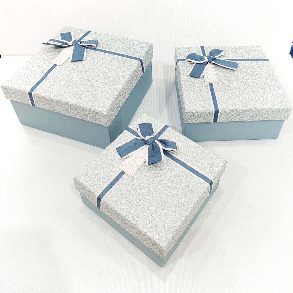 กล่องของขวัญขนาดกลาง สีขาวแต่งโบว์ฟ้า 3 ใบ