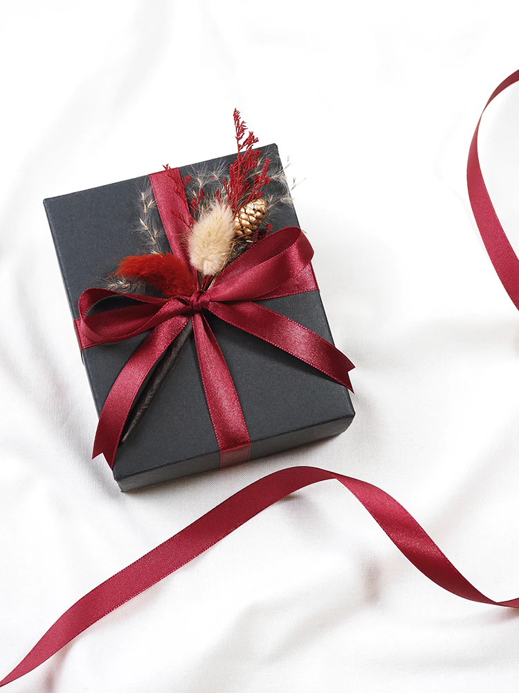 กล่องของขวัญสีดำ โบว์แดง แต่งดอกไม้แห่ง Luxury